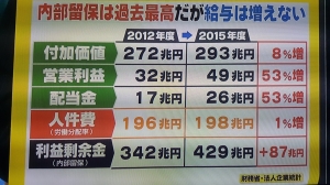 政府・与党は2017年度の税制改正で、賃上げを実施した 中小企業を対象に法人税の減税額を引き上げる方針を固めた。 大企業に比べて遅れている中小企業の賃上げを税制面から後押しして 国内の消費を底上げし経済の好循環につなげる狙いがあるとみられる。 YOMIURI ONLINE 11月7日 ここのところ企業はすごく儲かっているが 実はそれがあまり給与に反映されていないという数字。 内部留保は一番下の利益剰余金で 3年間で87兆円も増えており 営業利益・...