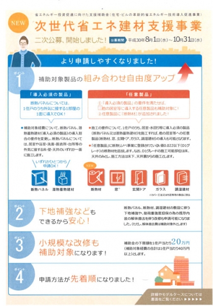40万円以上の工事で・・・ 断熱素材の半額が補助金として出ます! 補助額は200万円が上限ですが。 これは・・・ 大変な出来事です! 但し・・・ 次世代省エネ建材を使うことが『必須』 となっています その上・・・ ペアガラスや断熱サッシなどを使うことで その金額も加えた補助金の支給となるので 嬉しいじゃありませんか! 10月31日までの・・・ 『先着順受付』となり、予算を使い果たした所で 打ち切りとなりますので急がねばなりません! 詳しいこ...