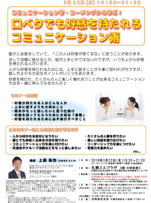 JUGEMテーマ:セミナー情報 おはようございます♪ 今日は10月度セミナーのご案内です。 ************************************** コミュニケーション学・コーチングから学ぶ! 口ベタでも好感を持たれるコミュニケーション術 ************************************** 誰かと会話をしていて、「この人は好感が持てるな」と思うことがあります。 決して流暢に話せるとか、話が上手とかではないのですが、 いつも人から好感を持たれる人...