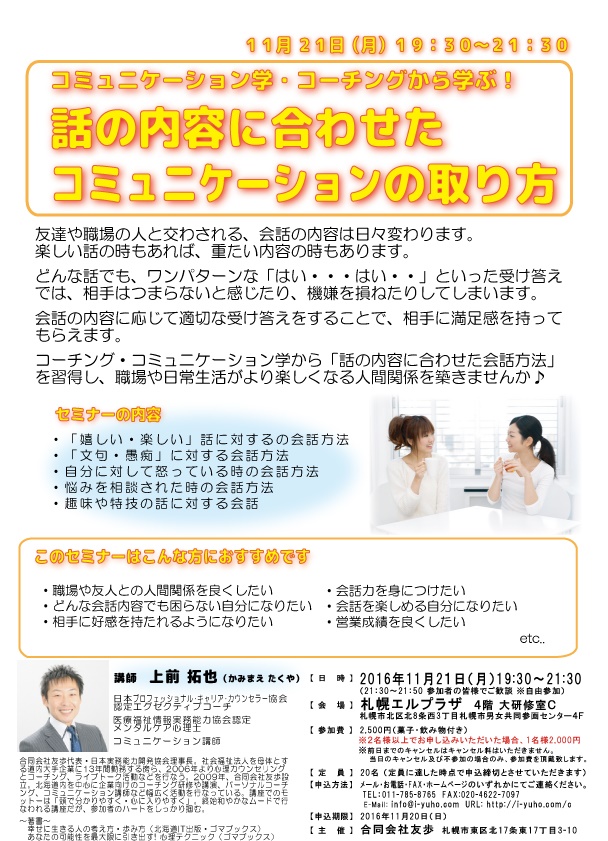 JUGEMテーマ:セミナー情報 おはようございます♪ 今日は11月度セミナーのご案内です。 ************************************** コミュニケーション学・コーチングから学ぶ! 話の内容に合わせたコミュニケーションの取り方 ************************************** 友達や職場の人と交わされる、会話の内容は日々変わります。 楽しい話の時もあれば、重たい内容の時もあります。 どんな話でも、ワンパターンな「はい・・・はい・・・」といった受け答えでは、 ...