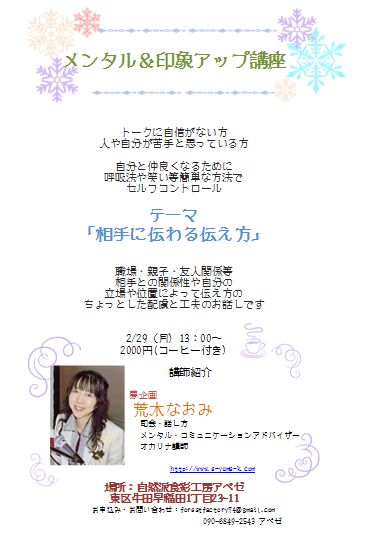 JUGEMテーマ:習い事・資格・講座 JUGEMテーマ:セミナー情報 暦の上では春となりました。 とはいえ、やっぱり2月は寒いですね(#^.^#) インフルエンザも大流行。 体に美味しいもの食べてウィルスなんてはじき飛ばしましょう!! さてさて、うるう年の今年は2月29日がありますね♪ そんな素敵な日には 荒木先生のセミナーにお越しになりませんか? お待ちしておりますm(_)m そういえば・・・ 節分は太巻きまるかじり。。。されました? アベゼの太巻きもとってもおいしくできあがりましたよ♪ 次...