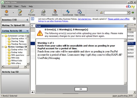 JUGEMテーマ:ネットビジネス ヤフオクが少しずつ売れ出して来ました。 ebayも少し頑張らなくてはと思い、昨日は出品をする。 turbo lister というツールを使うと既存の出品商品をコピーして 新しい出品ができたりして便利なので、もっぱらこれを使っている。 しかし、最近こんな警告画面が出る。 売れてもいないのにほんとにいいのか? ぐらいの警告らしい。 turbo lister は 出品しようとすると 費用計算をしてくる。 最近まで無料の計算だったのに $0.6やらいっ...