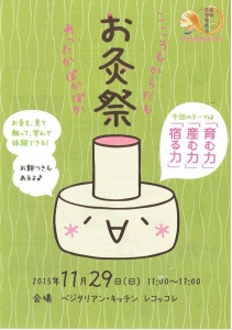 11月のイベントです。 鍼灸師の沙羅さんに声をかけていただき、 お灸祭りへの参加が決まりました。 ========================================= お灸祭り「宿す力・産む力・育む力」 【日時】11/29(日) 11:00〜17:00 【場所】ベジタリアンキッチン・レコッコレ (大阪市中央区) 【主催】関西女性鍼灸師の会『月の子どもたち』 ========================================= お灸を見て触って学んで体験できる! 鍼灸師さんの講演やワークショップ、 オーガニックランチもあるよ。 ap...