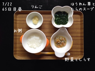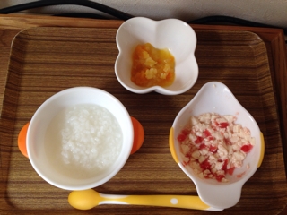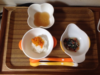 ・「たら+大根」粥・「にんじん+かぼちゃ」豆腐・「にんじん+ほうれん草+りんご」きなこごくごく普通のお昼ご飯。夕飯は・やわらか鶏のおかゆ・ささみと緑黄色野菜でした。合計で100グラム。未だに離乳食の適量がわからない…。決して多い方ではないと思うけども。今は食べる習慣がつけばいいやって感じです、適当、笑。まだ「母乳も好きなだけ」って段階らしいし。「母乳の量を減らしていきましょう」って段階になったらまた考えます、適当、笑。JUGEMテーマ:離乳食