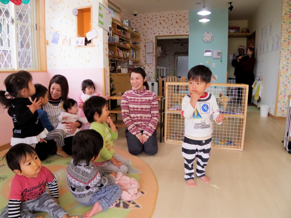 JUGEMテーマ:こどもと一緒に♪ 今日は、クリスマス音楽会!!何がはじまるのかなあ?子ども達はワクワクドキドキです。 どこからか素敵な音色が聴こえてきました。さあクリスマス音楽会のはじまりはじまり〜 「どこからか♪きよしこの夜の曲が聞こえてきたよ〜?」 あっ!!施設長と先生の登場です。 カホンやピアノ、フルートに合わせて、「♪山の音楽家」や 「♪幸せなら手をたたこう」をみんなで歌いました。 とっても素敵な音色にうっとり!! ...