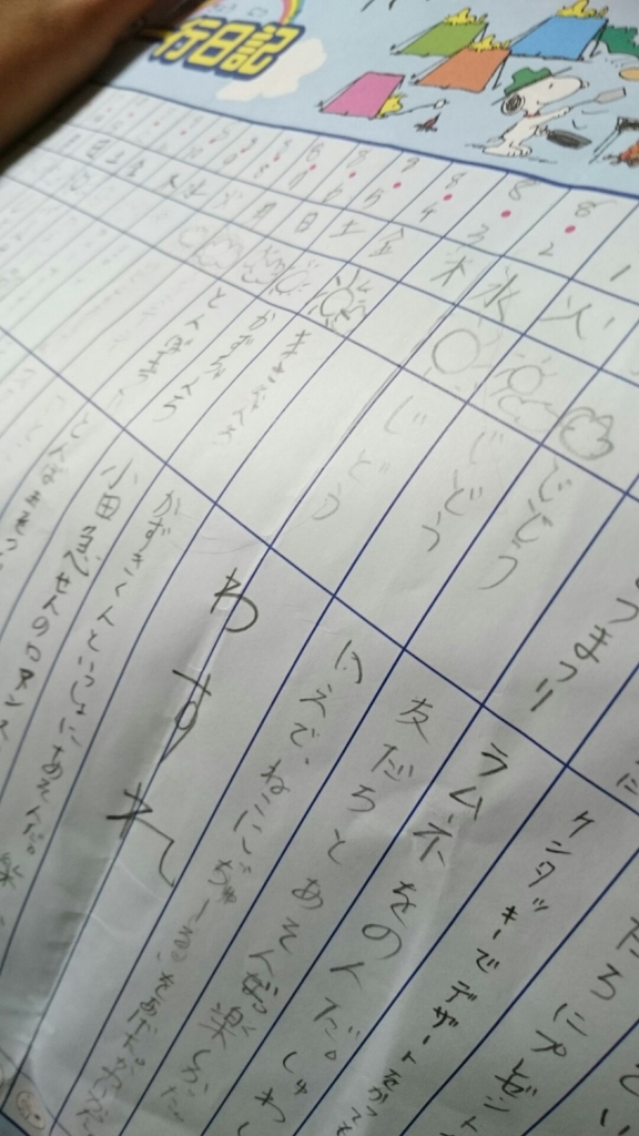 JUGEMテーマ:こどもと一緒に♪ 夏休みも一週間ほど。 我が家の「ねぇね」の宿題。 残りは絵画と毎日の一行日記だけとなりました。 絵は明日行うので、あとは毎日しなきゃならない 一行日記のみとなりますが(なる予定ですが) その、一行日記。 いったいどんなことを書いているのだろうと 寝静まってからこっそりみてみたら… 「わすれ」 はぁ????? おおかた、書き忘れて数日たち、書くことをすっかり 忘れたんでしょうけ...