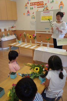 先日東京都花き振興協議会の花育のお手伝いで中央区勝どきの保育園に行ってきました♪ お花の名前当てクイズをしたりアレンジを作ったり、染料でお花を染める実験をしました。 ?牛乳パックを再利用したフラワーアレンジメント 【花材】 ヒマワリ、リンドウ、ケイトウ、スプレーマム、カーネーション、バラ、ガーベラ 保育園の先生からの依頼で夏の花と夏から秋にかけての花材を使用しました。 花の名前あてクイズを実施。バラ、カーネーション、ヒマワリは正解した子いましたが。あとの花材は誰も知...