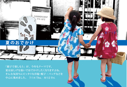 明日は七夕!昨年は残念ながら雨でしたが、 今年はお天気も良さそうなので、 天の川が見れるといいですね。 さてイベントのお知らせです。 今年も昨年に引き続き、親子でこの夏を楽しんでもらおうと、 涼しげな洋服、帽子、バックを中心に集めてみました。 子供服には、着物地をアレンジしたものや、 オーダー出来るTシャツや麦わら帽子など。 親子でお揃いを作る楽しみを味わってください。 オリジナルTシャツをご注文の方には、 無料でネームを入れさせていただきます。 ...