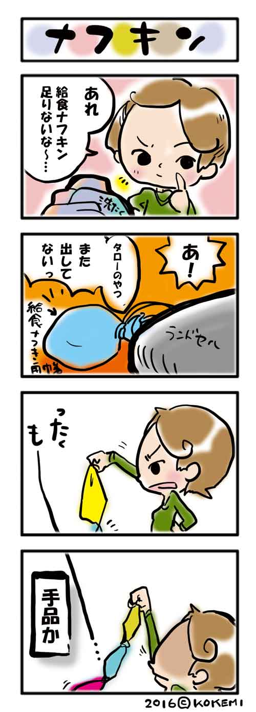 こんにちは!こけみです!! 上の四コマ、意味わかりますか?? 給食用ナフキンを持参するんですが、 そのナフキンがしょっちゅう行方不明になって 数が合わなくなるんですよ… そしたらこれです、 ナフキンまとめてお持ち帰り!! 子育てって、楽しいですね!!!(なげやり JUGEMテーマ:こどもと一緒に♪ スポンサーリンク