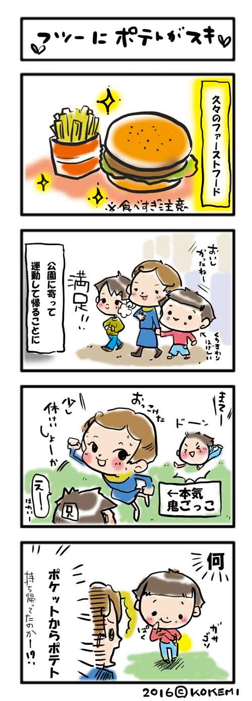 JUGEMテーマ:こどもと一緒に♪ こけみは子供好きなので あぞぶ時も子供と全力で遊ぶようにしてるんだけど、 持久力は子供の4分の1くらいしかないことを 30すぎて思い知りました 今回は まさかのランチポテトがポッケから登場で 大物か限りなく小物になるであろう ジロの行く末を案じた… まあ、マ○ドナルドに家族三人で食べに行った際には 周囲に迷惑がかかりすぎるので極力持ち帰りなんだけど… あ〜〜〜この気持ち 男の子の親の90パーセントはわかってもらえるはず...