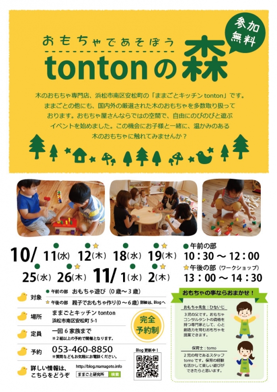 JUGEMテーマ:たのしいね、おもちゃ。 ☆最新予約状況☆ 10月・11月 tontonの森 「おもちゃで遊ぼう」が全8回、「work shop」が全4回 tontonの森のご紹介 幼児期の遊びは、心の栄養となり豊かな創造性や社会性・自発性を育んでくれます。 木製の床や壁に囲まれて木のおもちゃで遊ぶことができ リラックスしながら親子の時間を楽しむことができます。 多くの国内外の上質なおもちゃに触れることで新たな発見...
