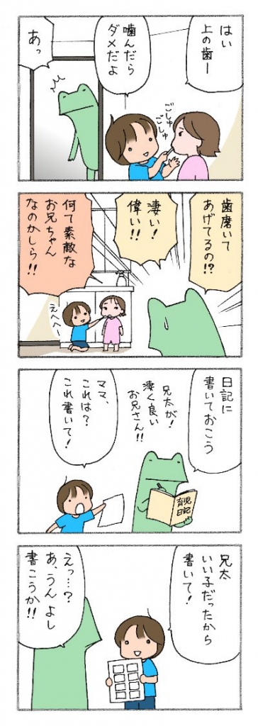 いつの間にか、自分のエピソードを漫画にされることを楽しみにするようになっていた息子。 漫画にしてほしいネタがあると自己申告してくるようになりました。 息子は割と歯磨きに抵抗なかったので、歯磨きにまつわる苦労は殆どせずに済んだのですが こうして兄に歯磨きされたり、兄が進んで歯磨きされるのを見ていたお陰か 妹の方も歯磨き平気な子に育ってくれました。 いやもう、本当に素敵なお兄ちゃん過ぎて親の私もびっくりですわ。 ...