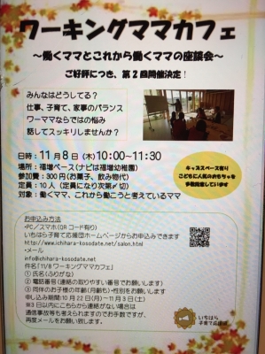 JUGEMテーマ:育児 おはようございます。 朝のひんやりとまだ混じりけのない空気で体を目覚めさせたムラジです。 街の至るところでジャック・オー・ランタンを見かけるようになりましたね。 4歳の息子は、まだまだ怖いらしく「ハロリン♪」とはいうものの、近づかず(笑)。 「ハロウィンだよ🎃」と言っても「ハロリン♪だよ!」と譲らない…。 さて、前回の「ワーキングママカフェ」がご好評をいただきまして、2回目開催することとなりました!!  ...