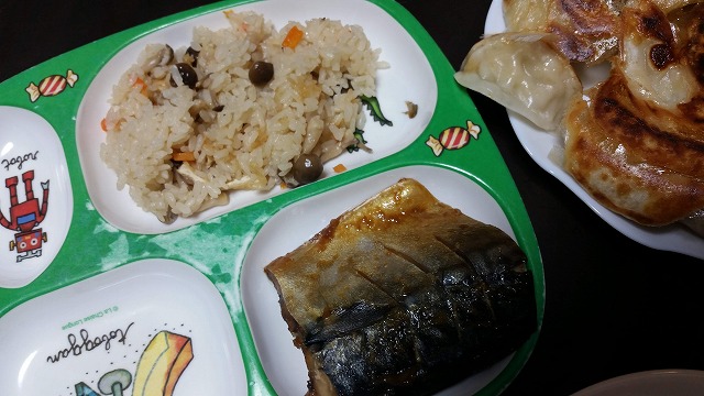 JUGEMテーマ:日記・一般 JUGEMテーマ:育児 どうも、たかゆきです。今日は男の晩ごはんになります。 初めて炊き込みご飯を作りました。レシピはネットから探してきました。具材はシンプルにニンジン、キノコ、揚げを使用し、調味料は4倍濃縮麺つゆと酒、みりん、しょうゆ少々です。 美味しく炊けるか心配でしたが、炊きあがりをみると上出来でした!(^^)/ あとはサバの煮付けとギョウザを焼きました。ギョウザは市販の生ギョウザをフライパンで焼いただ...