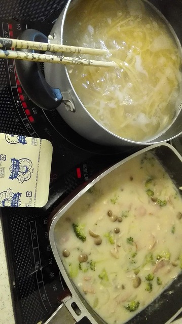 JUGEMテーマ:育児 どうも、たかゆきです。今日は男の晩ごはんになります。クリームパスタを作りました。 パスタはとってもカンタン!それに、フライパン1つで出来る料理★(*^^*) 具材はベーコン、ブロッコリー、えのき、玉ねぎで家にあった材料。本格的に作らないので市販クリームシチューの元と牛乳、コンソメ、塩コショウで味を整えていきました。 スープ状になってしまったら、小麦粉を入れてとろみをつけてあげます(*^^*)