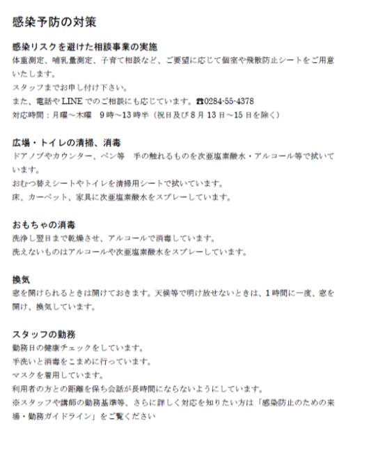 お出かけの際は以下の「感染予防のためのお願い」をお読みいただいてご来場ください。 感染予防のためのお願い ?お出かけ前にお子さんと保護者の方の体温を計り、体調チェックをしてからお出かけください。 発熱や風邪症状、呼吸器症状のある方、解熱後7日を経過していない方はご利用をお控えいただいております。 ?大人の方はマスクを着用してください。 ?スマホを拭き、手指を消毒してからご入場ください。 ?遊んだおもちゃは回収ボックスにお入れください。 ?感染リスクが高いため、広場でのお食...