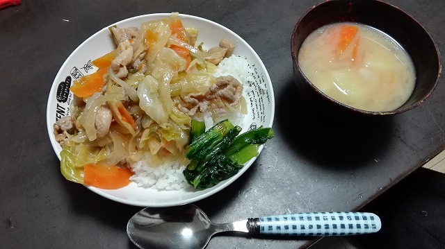JUGEMテーマ:育児 どうも、たかゆきです。今日の昼ごはんは野菜炒め、お浸し,味噌汁にしました。 野菜炒めに入れるお肉は短時間でもジップロックに入れて味付けタレに漬け込みます。写真はたかゆきの昼ご飯なので一つの皿にまとめて盛り付けました(^_-)-☆ 丼みたいにして食べても美味しいよ☆