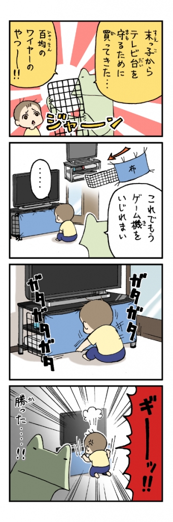 ご無沙汰してます。 勝ちました。 末っ子がテレビ台の中のゲーム機をいじるので、ガードを取り付けました。 布はね、前から張ってたんですけど、隙間から手を突っ込んでニンテンドーswitchを引きずり出すんですよ… switchがお気に入りなんですよ… まあ大きさも手ごろだし、持ちやすいし、コントローラーはカラフルだし、長男のポケモンボールが繋がってるしで気に入るのはわかりますよね。 気が付くと一人で抱えてうろついてるようになってしまったので、もう布...