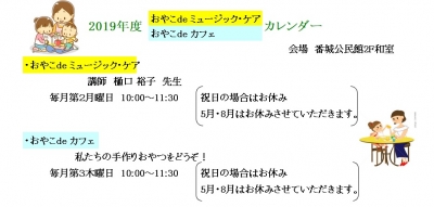 JUGEMテーマ:日々を楽しく JUGEMテーマ:日程 JUGEMテーマ:子育て JUGEMテーマ:育児 ***** 宇和島友の会からの報告です ***** 年間の予定表ができました ◎「おやこdeミュージック・ケア」 講師:樋口裕子先生 毎月第2月曜日 10:00=11:30 祝日の場合はお休み、5月8月はお休みです ◎「おやこdeカフェ」 私たちの手作りおやつをどうぞ! 毎月第3木曜日 10:00〜11:30 祝日の場合はお休み、5月8月はお休みです