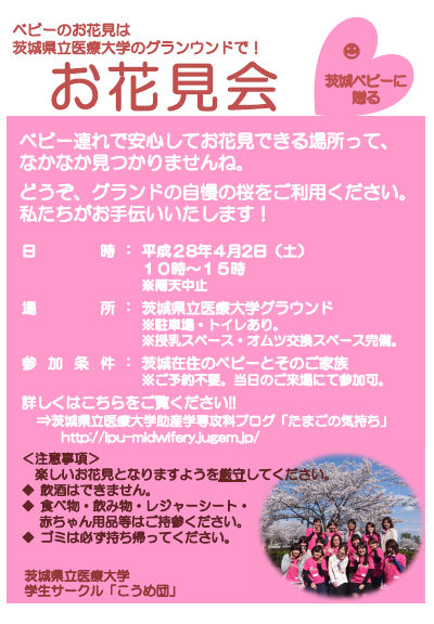 JUGEMテーマ:子育て情報 本日、無事に茨城ベビーに贈るお花見会」の日を迎えたこうめ団です。 さっそく何組かのご家族が来てくださいました 寒いものの、予報より少し暖かいような気がします。 12時現在、13.2℃。15時は14.4℃の予報。 雨は降らないようです。 午後にいらっしゃる皆さん。万全の防寒対策でいらしてください ホッカイロ無料配布中です(無くなりしだい終了)