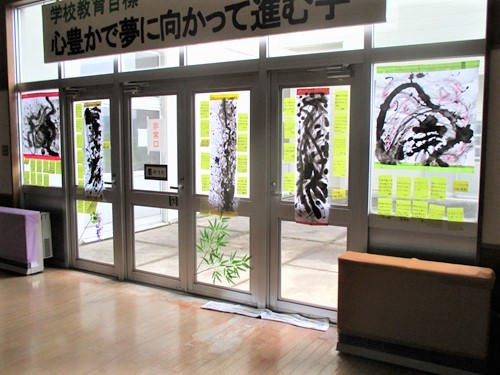 JUGEMテーマ:小学校生活のいろいろ 6年生が、図工「墨のうた」の作品をホールに展示しました。 一人一作品で、どれも素晴らしいものばかりです。
