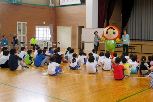 JUGEMテーマ:小学校生活のいろいろ 人権の花 植栽式が行われました。 (「人権まもる君」の登場に大喜び。) たて割り班ごとに協力して学校の玄関前に,プランターを置きました。 毎日の水やりと「思いやり」で,花を育てたいと思います。