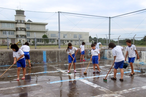 JUGEMテーマ:小学校生活のいろいろ 3〜6年生がプール清掃を行いました。 1年間たまった汚れをみんなで落として,綺麗なプールに戻りました。 水泳の学習が楽しみですね。 4・5・6年生はプールの中を掃除。 3年生はプールサイドやトイレ・更衣室を丁寧に掃除。