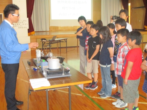 JUGEMテーマ:小学校生活のいろいろ 東北自然エネルギー株式会社のみなさんから,「再生可能エネルギー」についての出前授業をしていただきました。 北陽小学校の近くでも,風力発電や太陽光発電をしているところが増えています。 また,学校の屋上でも太陽光発電を行っています。 近年話題の「再生可能エネルギー」について,わかりやすく教えていただきました。 その中の「地熱発電」については,内容が新鮮でしたが,熱でタービンが回ったり照明が光ったりする様子に 子どもたちも驚いてい...