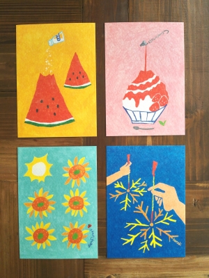 株式会社リュリュさんより、 夏柄のポストカードを 描かせていただきました。 スイカ、 かき氷、 ひまわり、 線香花火 の4種類です。 裏表と、それぞれストーリーを 感じさせるような内容です。 紙質はナチュラルで手触りのある質感。 全国のロフトさんや東急ハンズさんにて 本日より発売中ですので、 是非お手にとっていただけますように! JUGEM illustration にほんブログ村 イラストランキングへ イラストレーターランキングへ