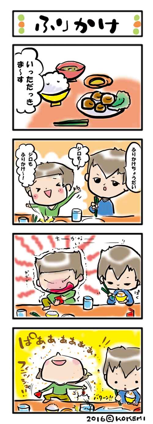 JUGEMテーマ:にこにこ育児絵日記 ご覧いただきありがとうございます 子供って、白いご飯に○○のせるのすきじゃないですか 我が子も漏れることなく好きです。はい 祭りか!!! ってくらいぶちまけてくれました。 こんな時、おさるのジョージに出てくる黄色い帽子のおじさんなら 『ジョージ〜!せっかくだからふりかけの開け方を勉強しよう!』 とかって工場見学とかにつれていくんでしょうね でも、こけみは倒れたコップも机にあげた足も ぐぉら〜!!!!!(怒) ...