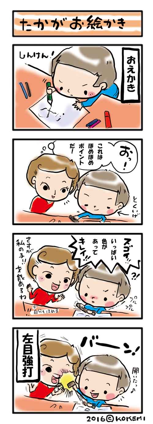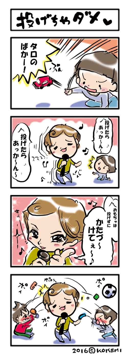 JUGEMテーマ:にこにこ育児絵日記 兄弟喧嘩が収まらない時 そのときはお互いを遠ざけるようにするこけみです そしたら次第に寂しくなって…仲直り なんてうまくいく訳もなく 遠くからイヤミを言い合うふたりの間で イライラが募り、 もーうるさい!!!!!!となる。 そして改めて両成敗。 あ、今流行ってるんだってね 両成敗 あれって、ベッキーちゃんばっかり悪くなってない? こけみは、 男の方はどうなのよ〜〜〜!と 思ってしまうけれど ほ...