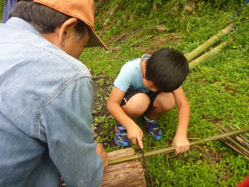 秋の終わりになって、今日は子ども達に竹を使って昔の遊び道具を再現。ノコを使って竹の節の上と下を切って基本となる形を作り上げます。 切り出しナイフを使ったり、ノコを使ったりと普段慣れていない道具もだんだんとうまく操れるようになってきます。 一通りみんなが出来上がったら、てっぽうに紙の玉を入れて、 少し離れた的に向かって「パーン」と音を立てて狙います。 的があると男の子は、無性に力が入って的に球が当たるまで何度もやっています。これって男の子の遺伝子の...