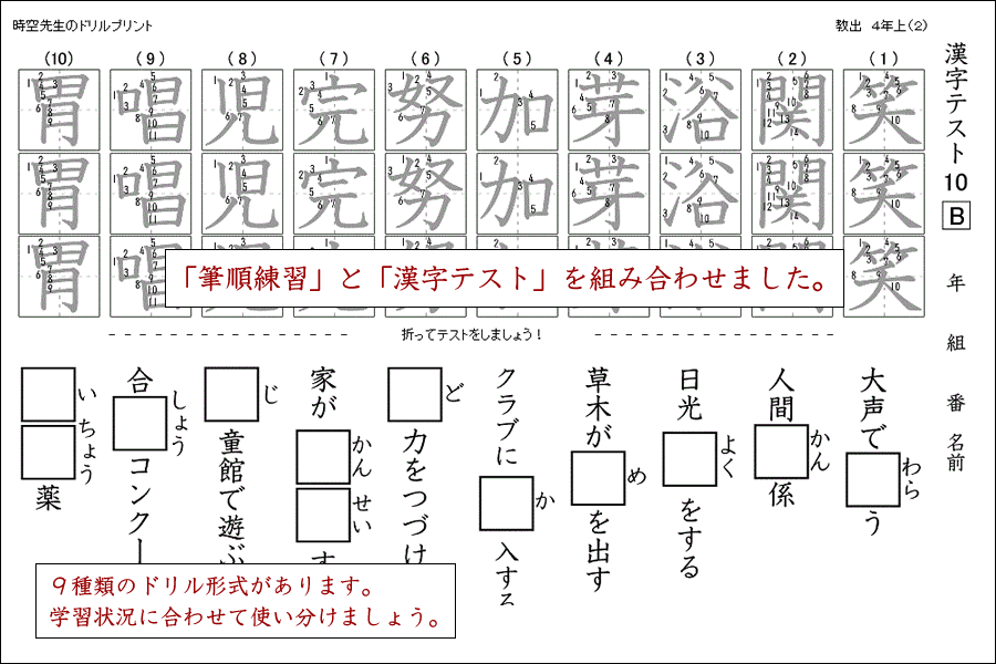 「時空先生のドリルプリント」サイトでは、色々な形式の漢字ドリルをアップしています。 下例は「筆順練習」と「漢字テスト」を組み合わせたドリルです。 上下半分に折って使います。 色々な形式のドリルをアップしていますので、是非、プリントサイトをご訪問ください。 時空先生のドリルプリント http://jikuukan.ac/Index.html 時空先生のドリルプリント JUGEMテーマ:小学生の子育て
