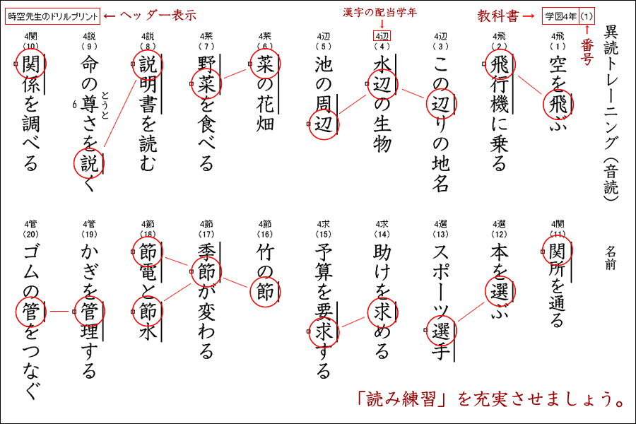 「時空先生のドリルプリント」サイトでは、色々な形式の漢字ドリルをアップしています。 下例は異読(いどく)トレーニングドリルです。 教科書に登場する漢字の異なる読み練習ができます。 お子様の音読を聞き、分からない読みや意味を教えてあげて下さい。 読み練習をすることによって語彙を一気に増やすことができます。 読み練習は書き練習より取り組み安いので、1年分を印刷して綴じて、いつでも練習できるようにしておきましょう。 色々な形式のドリルをアップしていますので、是非、プリントサイトをご訪...