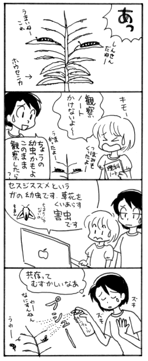 昨日までいなかったのに!いつの間にかホウセンカがぼろぼろになってしまっていました。もともと、学校で育ててたときもなぜかセロリちゃんのホウセンカだけ虫に食われてしまい、成長が遅かったのです。夏休みで家に持ち帰り、葉っぱが青々と元気になっていたのですが…虫に好かれるのも考えものです^^;