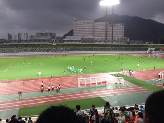 今夜は息子を連れて台風一過の雨の中、FC岐阜の試合を観に行ってきました。 途中からは、御覧の通りの雨の中、 ピッチには水たまりが出来ているような状況での試合でした。 そんな中で、前半に幸先よく先制したのですが 立て続けに2点取られて前半終了。 後半が開始したら直ぐに1点取られて1−3。 う〜ん、意気消沈をしていたのですが 後半は押せ押せ。 そんな中で、1点返し、2点返し同点。 そして、相手のペナルティエリア内ファアルを受けてPKを獲得。 このPKを見事に決めて逆転。 ...