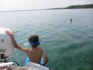 この夏の一コマより‥ ボートから飛び込んで、足の届かない所で泳ぐのは、結構度胸がいるのです。なので、飛び込むまでに時間がかかるR。^^;励ましながら、立ち泳ぎでひたすら待つJ。^^;それ〜!飛び込めたよ!