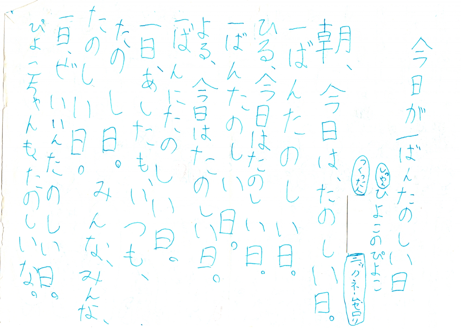 セロリちゃんが書いた詩です。 (学校の宿題とかじゃなくて、自分で書いてました) とても良く書けてると思うのでアップします。 こんな気持ちで毎日を過ごせたら素敵だよね〜(^^) ちなみに作中の『ぴよこちゃん』とは、 セロリちゃんがいつも遊んでいる小さなおふろアヒルです。