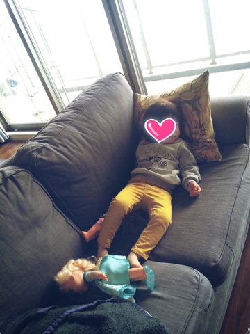 昨日の宣言通り本日は一日引きこもっていた私&こちゃるさん。 午前中てきとーにいつもの家事を済ませた後はこちゃるさんと一緒にテレビ見たり遊んだりだらだら… 外出まったくしなかったので書くネタも特にないんですが… 基本的に引きこもってる日は一緒に絵本読んだりおままごとしたりDVDかテレビ見てる事が多いです。 こちゃるさん、ソファに寝転んで大人しくしてるなーと思ってたら いつの間にか寝てた… 最近お昼寝はもうこのソファが定位置になってきてます。 もう夕方だったんだけど(うしろ...