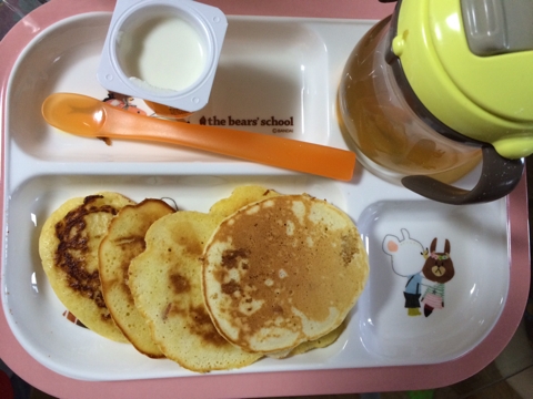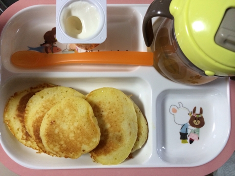 ☆離乳食255日目☆ ■1回目■ ・ウィンナー入りパンケーキ (ホットケーキミックス+牛乳+卵+ウィンナー(みじん切り)) ・プチダノン(りんご):1個(45g) ・麦茶 前にウィンナーあんまり食べなかったのでどうかなー?とおもったんですけど、みじん切りにしたら普通に美味しかったみたいで食べてました。 ちなみに今朝は私もめいやんも同じメニューでした。 (私たちはバター+ハチミツかけましたけど) 「手がべたべたになった…」 近くにあった私のお皿をべたっと触っちゃってハチミツが手に付いたのが気持ち悪...
