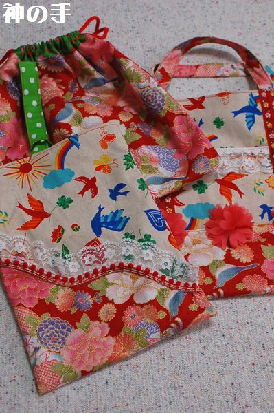JUGEMテーマ:入園・入学準備について・・・ 親友の娘ちゃんが今年の春に1年生に☆ そこで袋物を色々とお作りしました(*^。^*) 給食袋3点、ランチョンマット3枚、シューズケース、手提げバッグ、体操着袋です 和柄と洋柄を使用して仕立てて欲しいとのことで、その様にお作りしました! レースなども使用して可愛らしく(*^。^*) 娘ちゃんもとても喜んでくれた様で、私も作った甲斐が有ります 学校生活でたくさん使ってもらえますように☆ ●ショップはこちら→手作り子供服の通販店 神の手 ●商品はこちら&d...
