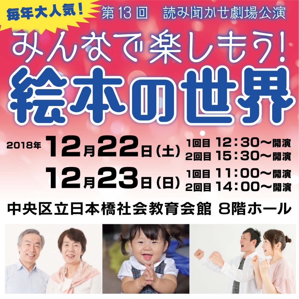 JUGEMテーマ:読み聞かせ絵本 今年もやります! 第13回 絵本の読み聞かせ劇場公演 「みんなで楽しもう!絵本の世界」 【公演日時】 1日2回公演 ●2018年12月22日(土) 12:30〜 / 15:30〜 ●2018年12月23日(日) 11:00〜 / 14:00〜 【会場】 日本橋社会教育会館 最寄駅:人形町、水天宮、浜...