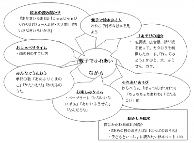 2015年度 0歳児の親子のための こころとこころをつなぐ 絵本の読み聞かせ 主催:川崎市男女共同参画センター(愛称 すくらむ21) 6月11日(木)の内容を紹介します。 ↓クリックして拡大 ―あそびの様子・活動をとおして― 2日ほど前に、関東地方も梅雨入りしました。雨は、自然物や私達にとって、必要不可欠の物ですが、雨の日が続くと、子育て中の親子にとっては、何かと大変なことがありますね。雨の日のすごし方みんなどうしているのかな?今回の「絵本の読み聞かせ」はそんな梅...