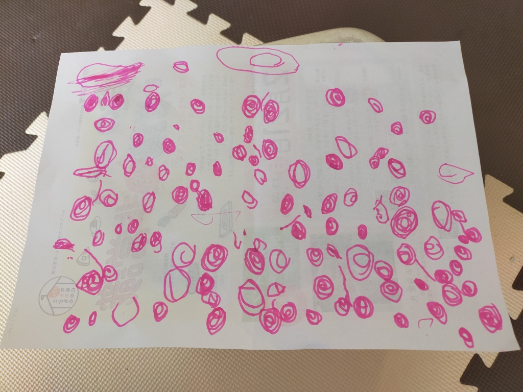 JUGEMテーマ:子育て日記 2歳10ヶ月のちびラッコ、こないだまでは熱心に草間彌生的な赤マルをひたすら描いておりました。 マルとマルは、有機的な繋がりを見せ始め、とうとう… これは顔なのか? たぶん、、顔だな。 目と目の間に、鼻らしきものがあるように見える。 しかも、髪の毛らしきものまで出現している。。 ほんの数週間で急に進化を見せ始めた。 ...