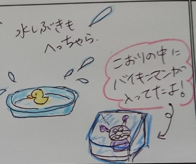 この日の記憶も曖昧なので、お迎え以降のことだけ書きます…。(9/6更新) 生活記録表に書かれてたこと。 お兄ちゃんのクラスでは、リズム遊びをしたり、 ケンケンパーや、馬になりきって遊んだりしたそうです。 水遊びでは、おもちゃを閉じ込めて凍らせた氷を触って、 冷たくて気持ちよさそうにみんな遊んでました、とのことでした。 先生準備大変だっただろうな〜。 みんなが楽しめるための準備が本当いつも大変そう。 家じゃなかなかできないし、ありがたいですね。 ...