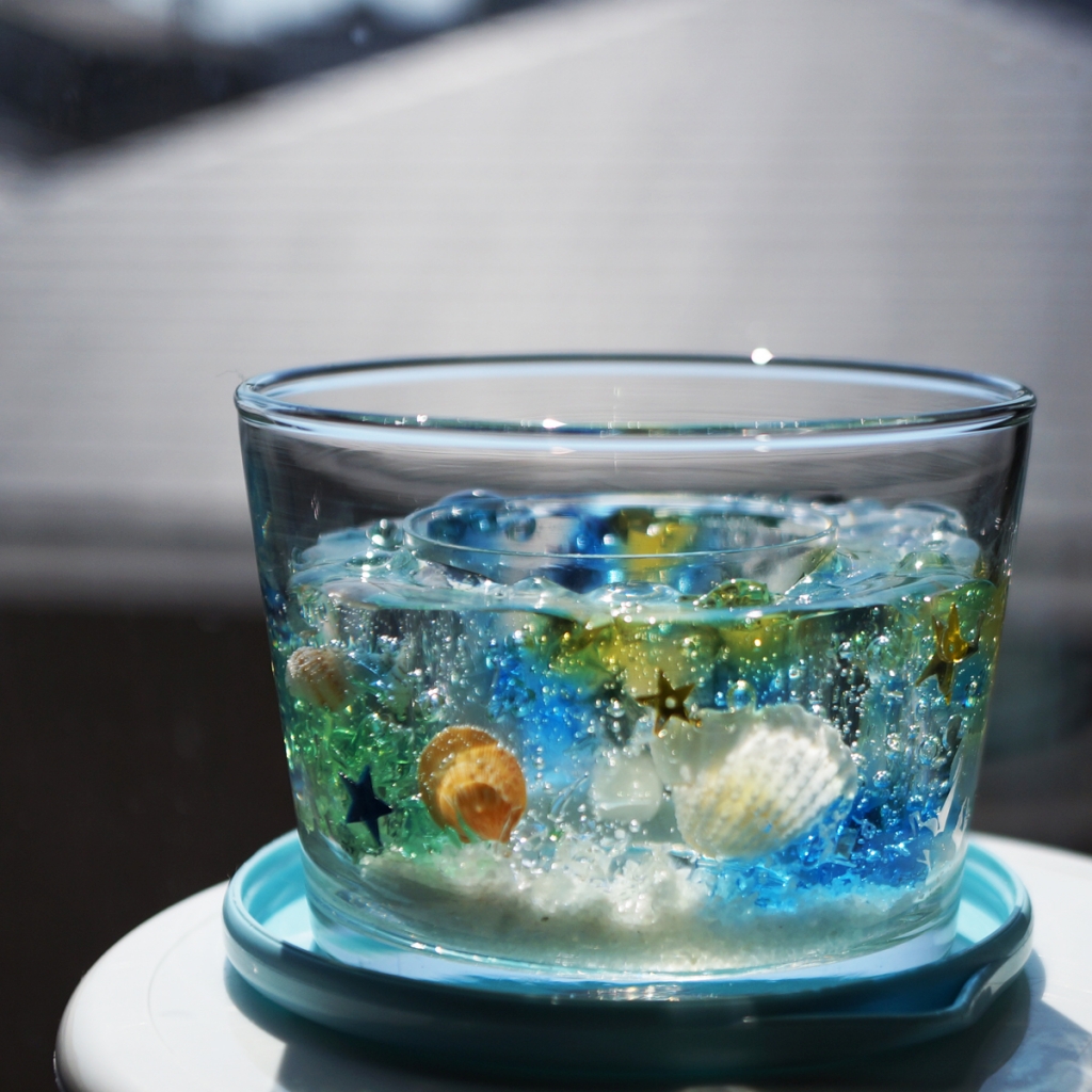 光が当たるとキラキラ光るホルダーです。グラスの中に小さなカップが入っており、そのカップに小さなキャンドルやLEDライトを入れて灯せば素敵なキャンドルホルダーに。 それ以外にもアロマボトルを立てれば置くだけで可愛いデュフューザーにもなります。 写真付き作り方レシピも付いています。 途中ゼリーを温めて溶かす作業がありますのでお子様は大人の方と一緒に楽しんでいただければと思います。( ロウを流し込むのは当日でなくても大丈夫です ) [ 用意するもの ] ピ...