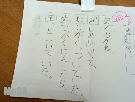 小学生の面白回答ばかりを集めたYoutubeを昔見たことがあるんですが、 バニーが昨日もって帰ってきた国語の言葉遊びのプリントが独創的すぎました(;´Д`) あいうえおの好きな行をつかって文章を作るらしいです↓ バニーは「まみむめも」をチョイス。 つっこみたいところはたくさんあるんだけど、枕に「みしみし」いう虫が付いているって…おいっ。 ついでに、目で確認したところ、かなりの虫がついていたって、 お前、これホラーだよ!!! ΣΣ(゚Д゚;) 妖怪図...