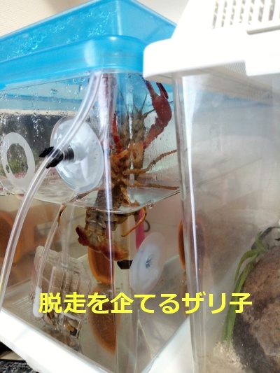 メリーがとってきたザリガニのザリ子ちゃん(本名:リボンちゃん。でも誰も呼んでいない) 我家で健やかにお過ごしです。 ブクブク(エアーポンプ)購入後、かなり住み心地が良くなったせいかめっちゃ元気(´∀`σ)σ レンコン輪切りでがぶがぶ食べてます。 そしてよく脱走を試みています↓ エアーポンプのホースをつたってガンガン天井をどつくおてんばっ子(ノз`) そして豪快にがしゃーーーんという音と共に落下しています。 甲殻類...