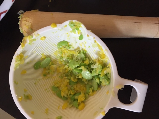 JUGEMテーマ:子育て日記 今日の夕飯に、枝豆とトウモロコシがありました。 実は先日、娘の下の乳歯がグラグラしていたので、 歯医者に行き、2本抜いたところです。 歯抜けになっている娘には、トウモロコシを食べるのはちょっと難しい。 なので、トウモロコシは、コーンだけを削ってお皿へ。 すると娘が突如、トウモロコシのコーンと枝豆をお皿に混ぜ、 すりこぎ棒を出してきて、つぶし始めたのです。 それなら、ということで、娘の離乳食...