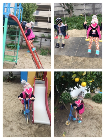 今日はたまたま近所の公立幼稚園で園庭解放があったのでRくんといっしょに行ってきました。 最初の1時間は園庭で自由遊び〜。 好きなのになかなか難しいキックスケーター頑張って漕いでいました(笑) 基本的に未就園時だったら何歳でも参加OKだったようですが、自由遊びは園児さんもいっしょに遊んでたのでちょっとヒヤッとする場面もあったんですけど、お兄ちゃんお姉ちゃんたちがすごーく優しくて、上記のキックスケーターもこちゃるさんが「やりたい!!」って喚いてたら近くにいたお姉ちゃんが「使って良いよー」って貸して...